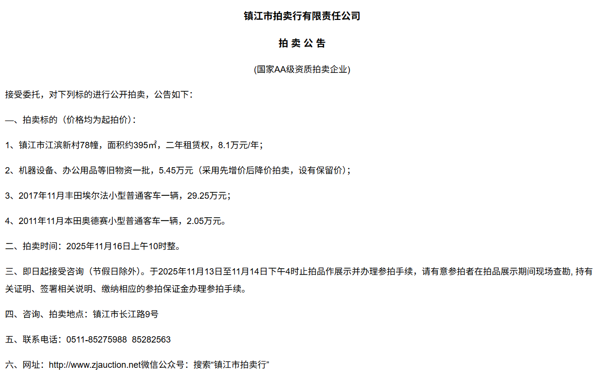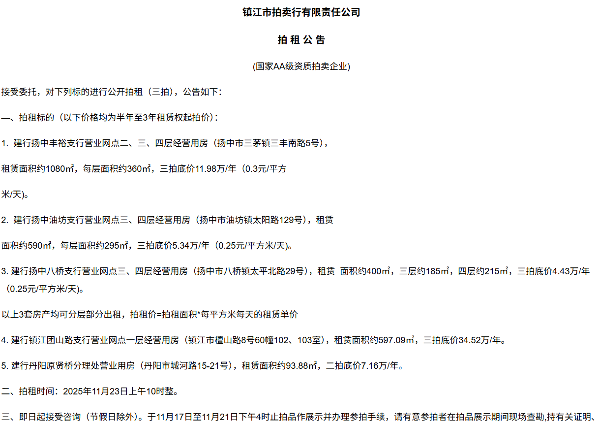 鎮江市拍賣行有限責任公司拍 租 公 吿(國家AA級資質拍賣企業)接受委托,對下列標的進行公開拍租(三拍),公告如下:—、拍租標的(以下價格均為半年至3年租賃權起拍價):1.  建行揚中豐裕支行營業網點二、三、四層經營用房(揚中市三茅鎮三豐南路5號),租賃面積約1080㎡,每層面積約360㎡,三拍底價11.98萬/年(0.3元/平方米/天)。2.  建行揚中油坊支行營業網點三、四層經營用房(揚中市油坊鎮太陽路129號),租賃面積約590㎡,每層面積約295㎡,三拍底價5.34萬/年(0.25元/平方米/天)。3. 建行揚中八橋支行營業網點三、四層經營用房(揚中市八橋鎮太平北路29號),租賃  面積約400㎡,三層約185㎡,四層約215㎡,三拍底價4.43萬/年(0.25元/平方米/天)。以上3套房產均可分層部分出租,拍租價=拍租面積*每平方米每天的租賃單價4. 建行鎮江團山路支行營業網點一層經營用房(鎮江市檀山路8號60幢102、103室),租賃面積約597.09㎡,三拍底價34.52萬/年。5. 建行丹陽原賢橋分理處營業用房(丹陽市城河路15-21號),租賃面積約93.88㎡,二拍底價7.16萬/年。二、拍租時間:2025年11月23日上午10時整。三、即日起接受咨詢(節假日除外)。于11月17日至11月21日下午4時止拍品作展示并辦理參拍手續,請有意參拍者在拍品展示期間現場查勘,持有關證明、簽署相關說明、繳納相應的參拍保證金辦理參拍手續。四、咨詢、拍租地點:鎮江市長江路9號五、聯系方式:0511-85275988   13655299933楊先生六、網址:http://www_zjauction_net.server-tutorials.com;微信公眾號:搜索“鎮江市拍賣行” 拍品清單2025.11.23序號名稱起拍價(元)標的說明1建行揚中豐裕支行營業網點二、三、四層經營用房(揚中市三茅鎮三豐南路5號),租賃面積約1080㎡,每層面積約360㎡三拍底價11.98萬/年(0.3元/平方米/天)1、1-3號房產均可分層部分出租,拍租價=拍租面積*每平方米每天的租賃單價;2、意向競拍人在拍賣前需持營業執照或身份證與委托方說明租賃房產經營業態,確定意向后出具房產承租用途承諾書,經委托方審核后,方可交納保證金參加競拍;3、租賃期限為半年至3年(承租方與出租方協商而定),承租方每半年或一年結付租金,租賃期間的水、電費用及其它相關費用均由承租方承擔;4、承租方不得用于經營和保管危險物品,不得用于開設餐飲、娛樂等可能嚴重影響消防安全、運營安全的經營業態,不得用于經營委托貸款、小額貸款等可能冒用委托方名義,帶來聲譽風險的經營業態。租賃期內,承租方不得破壞墻體結構,自行成就消防、安全等使用條件,不得擅自將租賃房屋轉租、轉讓給他人使用,否則委托方有權收回房屋;5、拍租成交后,承租方將租金交至出租方指定賬戶,傭金交至拍賣方賬戶(拍租傭金為該房屋一個月租金)。承租方憑租賃合同無息退還保證金。2建行揚中油坊支行營業網點三、四層經營用房(揚中市油坊鎮太陽路129號),租賃面積約590㎡,每層面積約295㎡三拍底價5.34萬/年(0.25元/平方米/天)3建行揚中八橋支行營業網點三、四層經營用房(揚中市八橋鎮太平北路29號),租賃面積約490㎡,每層面積約245㎡三拍底價4.43萬/年(0.25元/平方米/天)4建行鎮江團山路支行營業網點一層經營用房(鎮江市檀山路8號60幢102、103室),建筑面積約597.09㎡三拍底價34.52萬/年5建行丹陽原賢橋分理處營業用房(丹陽市城河路15-21號),建筑面積約93.88㎡二拍底價7.16萬/年
